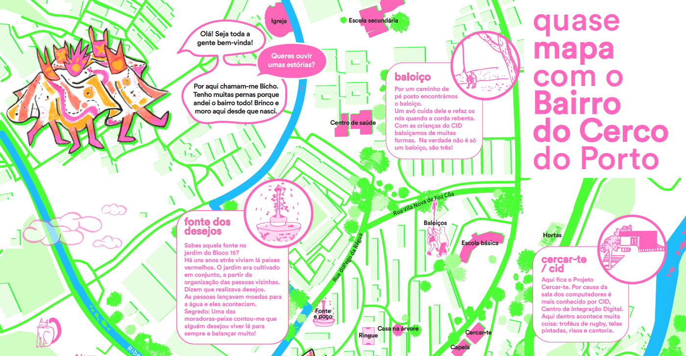 Quase mapa com o Bairro do Cerco do Porto é o resultado gráfico de um processo de mapeamento colaborativo realizado entre janeiro de 2024 e dezembro de 2025, com moradores, do Bairro do Cerco do Porto e crianças e adolescentes do Projeto Cercar-te, também moradores do bairro e suas imediações.
